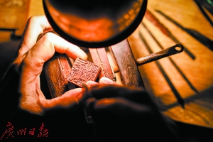 顧名思義,疊字印就是在印章的字上再刻字,下面的字細(xì),上面的字粗。“刻一個(gè)疊字印要兩天,如果是比賽的話,一個(gè)小時(shí)左右就能搞定?!表?xiàng)頌秋說。