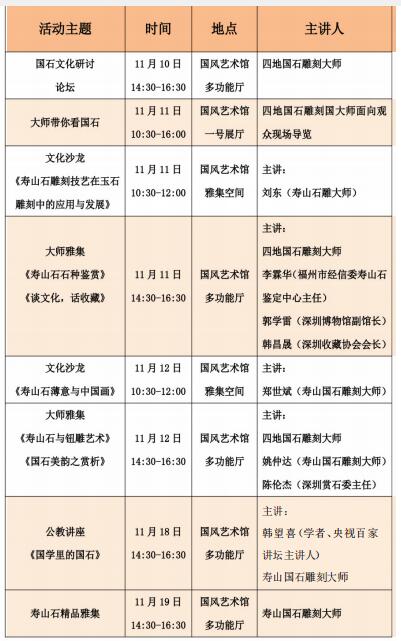不僅如此,來(lái)自四地的國(guó)家級(jí)、省級(jí)工藝美術(shù)大師、非物質(zhì)文化遺產(chǎn)傳人將親臨深圳, 展覽期間,舉辦名家對(duì)話(huà)論壇,開(kāi)設(shè)兩場(chǎng)名石雕刻藝術(shù)公開(kāi)講座,另逢周末將特邀兩位國(guó)石大師在現(xiàn)場(chǎng)為觀眾導(dǎo)賞。