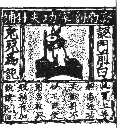 在中國(guó)國(guó)家博物館,陳列著一塊北宋年間“濟(jì)南劉家功夫針鋪”用來印刷廣告的銅雕版,其長(zhǎng)12.4厘米,寬13.2厘米,畫面正中是一只站立搗藥的白兔,左右注明“認(rèn)門前白兔兒為記”,這是在告訴買家“一定要認(rèn)準(zhǔn)本店的白兔搗藥商標(biāo)進(jìn)行選購”;白兔下方廣告文辭稱:“收買上等鋼條,造功夫細(xì)針,不誤宅院使用。轉(zhuǎn)賣興販,別有加饒,謂記白”,意思是說:“我們家用最好的原材料,花費(fèi)功夫造針,使用方便。如果有人想批發(fā)轉(zhuǎn)買,還可以優(yōu)惠,但要告訴買者或注明是白兔牌的產(chǎn)品”。這件“濟(jì)南劉家功夫針鋪”銅雕版是已知世界上最早出現(xiàn)的商標(biāo)廣告實(shí)物。宋代使用銅版印刷的廣告,既可以做產(chǎn)品的包裝,也可以做廣告招貼的海報(bào)或者傳單,這種紙單在宋代叫“仿單”或“裹貼”。