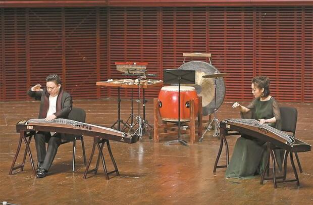 葉小綱創(chuàng)作的古箏獨奏曲《林泉》,可謂清新脫俗,奔涌跌宕,用多種創(chuàng)作手段和高難的演奏技法,將自然界晦明更迭、晴雨接踵、清泉潺潺、惡風(fēng)獵獵的生動景象加以細致描摹,給古箏的藝術(shù)表現(xiàn)帶來更多的可能性。宋心馨功底好,善表演,表現(xiàn)出人琴合一、情音互融的美好意象。筆者這一代愛樂者大都聽過劉文金的二胡名曲《豫北敘事曲》,此次演奏的是這位民樂大師生前創(chuàng)作的無伴奏二胡二重奏《火·彩衣姑娘》。劉老此曲一改長期延用的傳統(tǒng)路線而風(fēng)格大變,透露其晚年依然旺盛的創(chuàng)新活力。宋飛師徒身著紫、青兩色連衣裙玉立演奏,“風(fēng)吹仙袂飄飄舉”,細膩呈現(xiàn)出此曲熱烈、浪漫、溫柔、含蓄的豐富層次,從作品到臺容都給人全新的藝術(shù)感受。