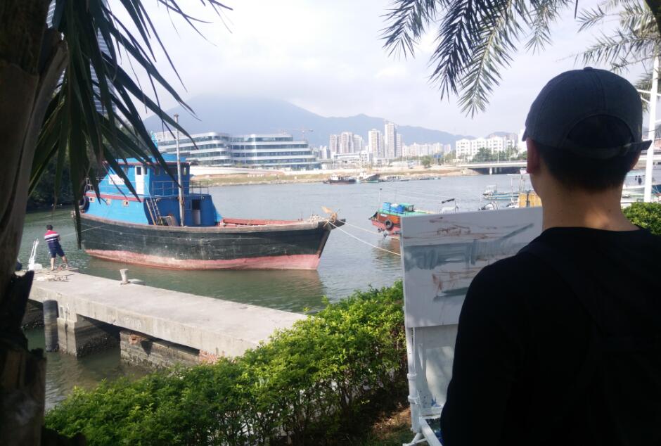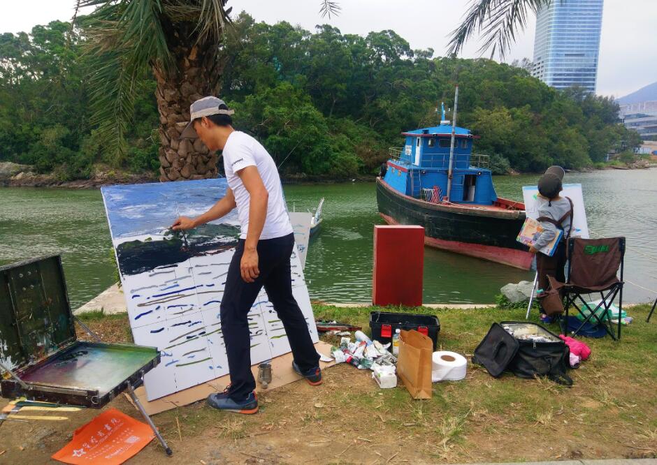 優(yōu)美的景色映入畫家們眼簾,點燃了他們的創(chuàng)作激情。來到鹽田之后,藝術家們紛紛找好寫生地點,擺好畫架,迅速進入創(chuàng)作的狀態(tài)。他們當中一部分來到了鹽田漁港,鹽田海鮮街后的小漁村避風港。蔚藍的大海、旁邊的綠樹、避風塘內(nèi)停泊的船只、白色的海鳥、釣魚的人以及遠方火熱的建設場景都呈現(xiàn)在畫家的筆端;另一部分藝術家來到了位于三洲田深圳會計進修學院的梧桐溪谷,小橋流水人家、奇石山林則一一被傾注于畫紙。
