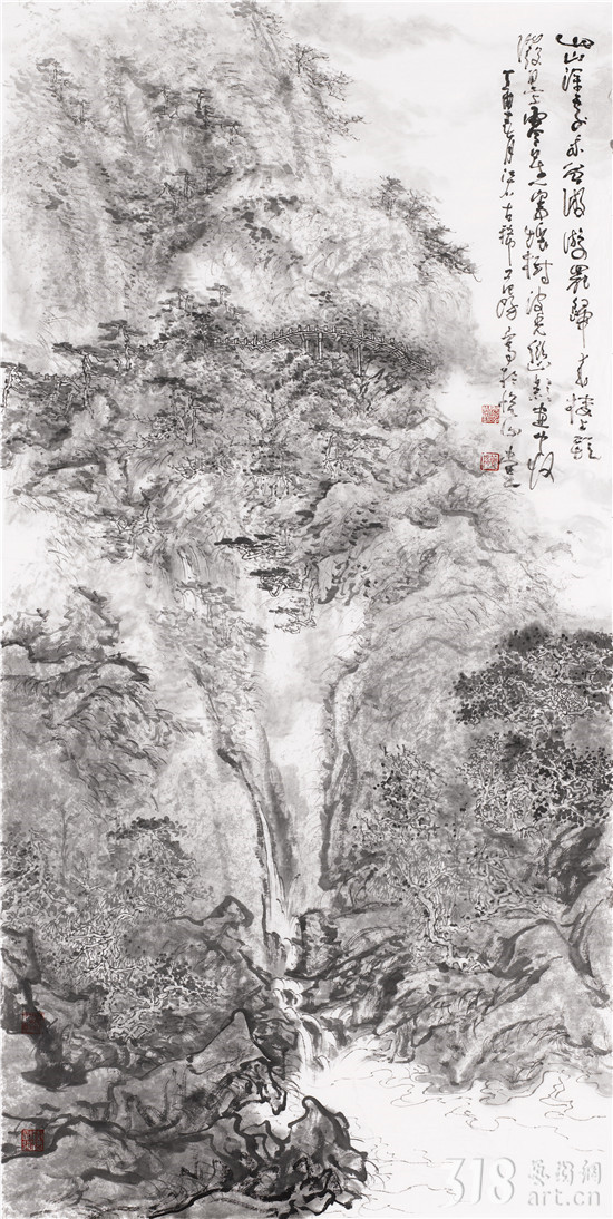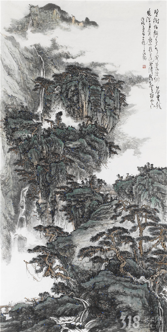 我以為,范陽(yáng)先生是真正在心性上貼近古人“不下堂筵,坐窮泉壑”,其現(xiàn)居贛中名岳武功山、楊岐山之中。尤其武功山,史上與衡山、廬山并稱江南三大名山,被冠以“衡首廬尾武功中”,山脈綿延浩瀚,茫茫無(wú)際。范陽(yáng)先生終日面山臨壑,弄筆自適,得武功真容。山水畫從來(lái)就不是簡(jiǎn)單的描摹自然的風(fēng)光,無(wú)論丘園養(yǎng)素還是泉石嘯傲,都是畫者精神的自然流露,這是畫家筆墨情態(tài)的表達(dá),亦是畫家藝術(shù)境界追求的體現(xiàn)。對(duì)于山林的描繪,承載了畫者對(duì)泉石意趣的向往,對(duì)于林下境界的追求。范陽(yáng)先生的山水畫作品長(zhǎng)于布景,對(duì)山中的“陰、晴、朝、夕”的細(xì)膩描繪都有他自已獨(dú)特感悟和表達(dá)。筆下極丘壑浩渺之勢(shì),奇峰羅列,宛有風(fēng)骨,深壑幽谷,其勢(shì)超峻;至于松柏掩映,峭壁涌泉,野道幽麓,于野逸之態(tài)甚備。范陽(yáng)先生數(shù)十年來(lái)遍臨南北宗諸家,遠(yuǎn)溯元人四家,清初四王,近至黃秋園,上下求索,崇穆有加,最終歸皈真逸正脈。新近年逾七十之作,日漸精熟,蒼腴古厚,更趨融古化古之態(tài),細(xì)究其筆下蹤跡:子久?麓臺(tái)?秋園?各不相肖,而莫不精備。諦觀其中景象:匡廬?武功?羅霄?渾然而化,不一而足。如此境地當(dāng)稱“妙解”。
