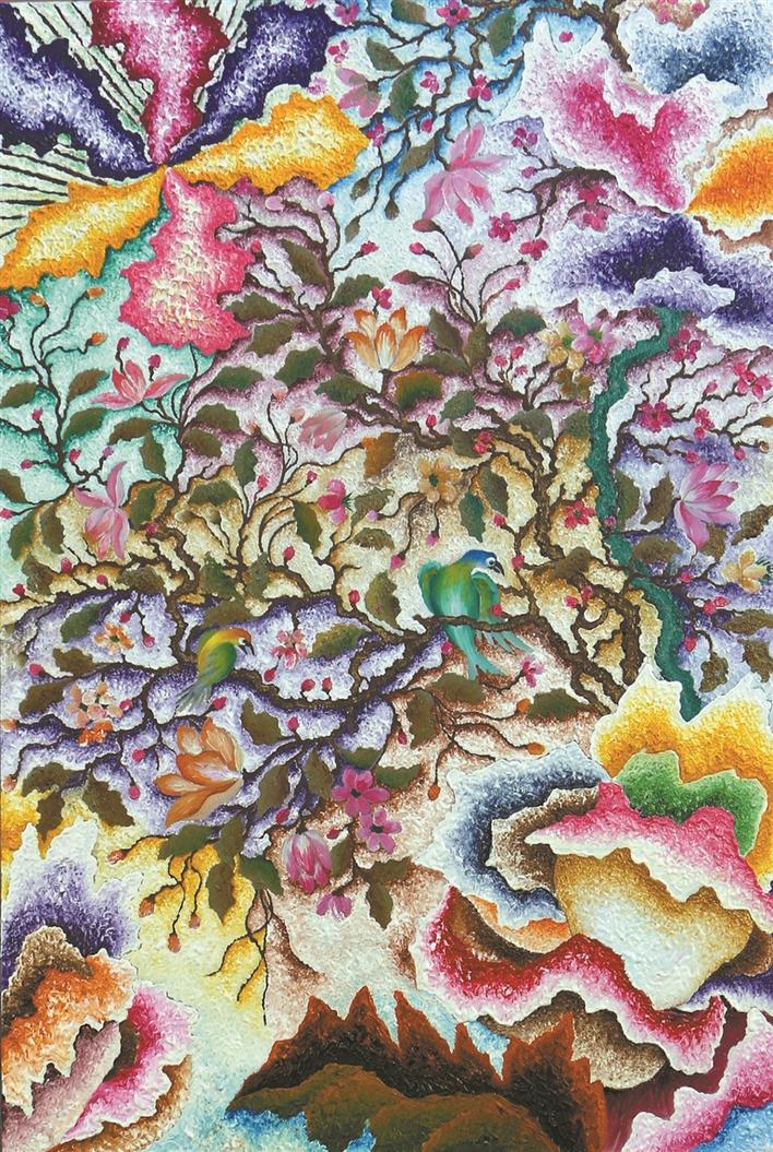 色彩是鄭澤生作品的一大亮點。這源自他第一份工作是在深圳增邦印花廠學調色,長期的訓練和刻苦的努力練就了他對色彩的敏感度?!断诺南愀窭锢愤@組作品可以說是他近期創(chuàng)作中布局最為精細、顏色最為豐富的代表作之一。畫面布滿圖騰式的形象,萬物共生。此時鄭澤生處理群像時顯現(xiàn)出一派欣欣向榮的景象,每一寸都散發(fā)著生命的光輝和絢爛。