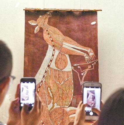 樹皮畫是人類一項古老的藝術(shù),也是澳大利亞原住民延續(xù)保留至今的一種藝術(shù)形式。澳大利亞的樹皮畫承載了深厚的文化和思想內(nèi)涵,被稱為是“活著的”原始繪畫。本次展覽展示了位于澳大利亞北海岸線的阿納姆地原住民藝術(shù)家創(chuàng)作的120余件樹皮繪畫,以及繪制工具、木雕木刻等,反映了澳大利亞原住民對世界的理解和認識,以及他們的生活習俗、精神世界與文化傳統(tǒng),也展現(xiàn)了澳大利亞原始藝術(shù)的鮮明特色。
