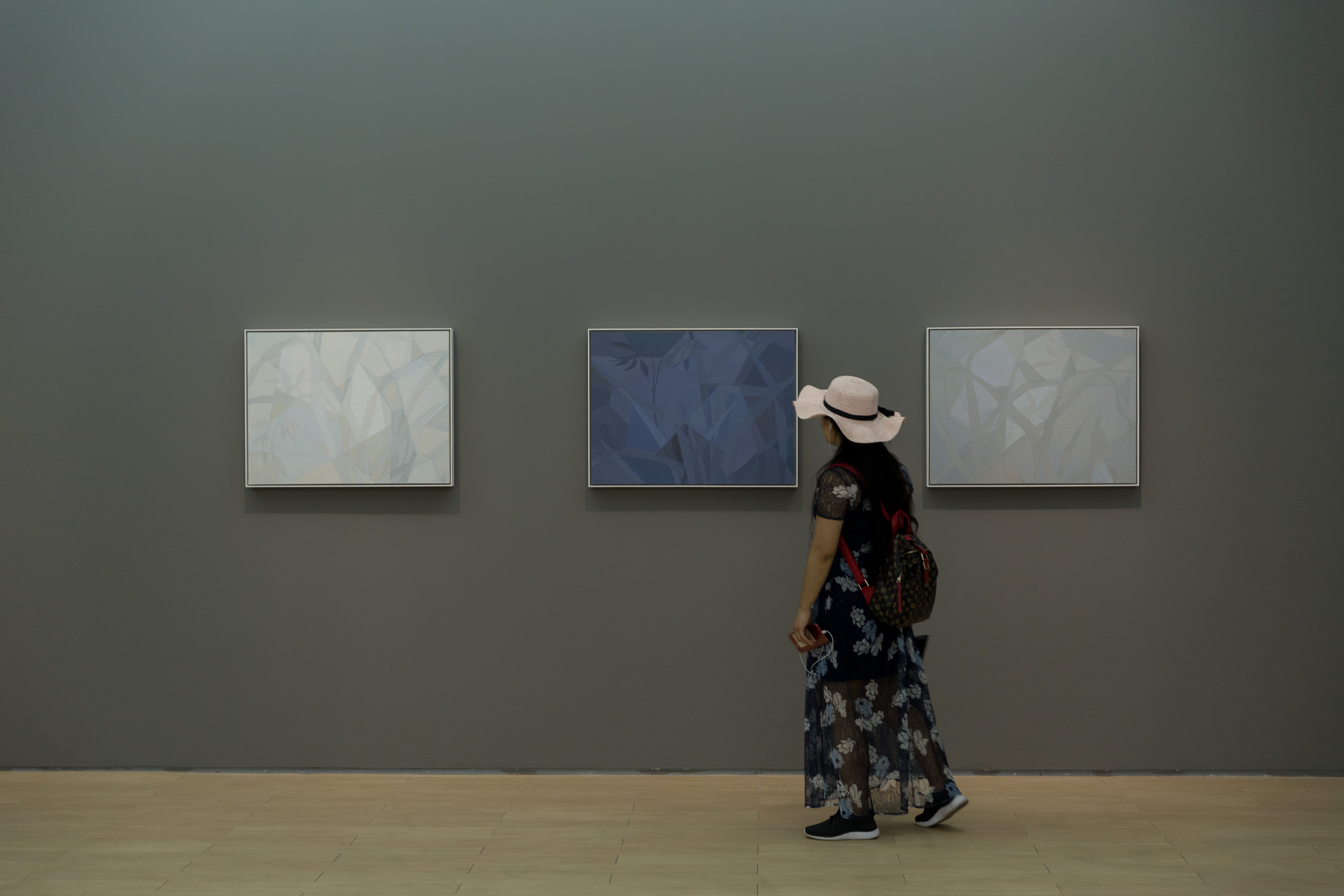 自2013年王豪開始以水泥作為個人創(chuàng)作媒介以來,三個系列“寂”、“樸”、“遠”并行展開。“寂”和“樸”強調(diào)水泥作品的靜態(tài)特征,不論是單件作品還是多件組合作品,在水泥材料的細微變化與色塊搭配上,力求傳達出一種寧靜、樸拙的整體氣息;“樸”系列在形式上更為豐富,不僅嘗試使用斜線、三角形乃至圓形,還探索富于中國古典韻味的形式表達;“遠”系列的名稱則來源于中國傳統(tǒng)山水繪畫所特有的透視技法“三遠”概念,這系列作品意圖通過畫面的動態(tài)表現(xiàn)打破二維空間限定,拓展平面繪畫的深度與廣度,從美學(xué)意境上與高遠、深遠、平遠相融合。