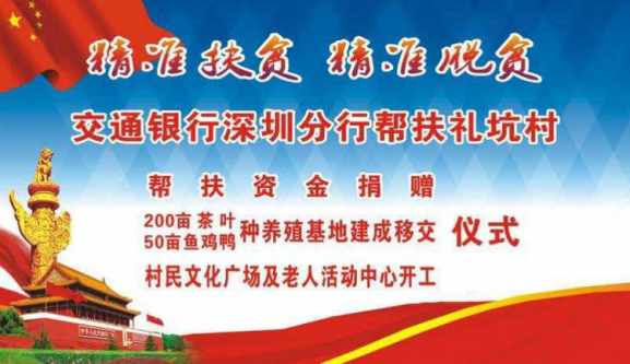 自交通銀行深圳分行對口幫扶禮坑村,開展"雙精準"扶貧以來,禮坑的經(jīng)濟社會發(fā)展和村容村貌發(fā)生顯著變化,積貧積弱的小山村呈現(xiàn)欣欣向榮的新氣象。積土成山、積水成淵,200畝茶山破土而出、蔚然成綠,50畝養(yǎng)殖基地竣工落成、生機勃勃,三萬魚苗、數(shù)千雞苗茁壯生長,村民文化廣場、老年活動中心、道路硬底項目、山村亮燈工程躍然紙上,逐次開工建設,禮坑正創(chuàng)造并綻放新的希望,村民笑容淳厚,各級由衷點贊。紫金縣領導、縣扶貧工作總負責人廖振輝表示:"交通銀行深圳分行是真重視、真扶貧、扶真貧,在對口紫金的扶貧單位中首屈一指,無論在河源市的扶貧工作考評中,還是在代表河源參加的廣東省扶貧工作考評中,雙雙獲得優(yōu)秀評價,真誠感謝交行,紫金要和交行一起努力,讓禮坑成為社會主義新農(nóng)村示范村建設中的示范點"。