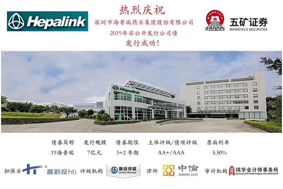 據(jù)悉,此次私募債券“19海普瑞”發(fā)行規(guī)模為7億元,期限3+2年,票面利率5.5%。在深圳高新投的助力下,債券募集過程中,得到了各大金融機(jī)構(gòu)的踴躍認(rèn)購,獲得2倍超額認(rèn)購額,5.5%的票面利率也創(chuàng)下近期AA+民營企業(yè)發(fā)債利率新低。