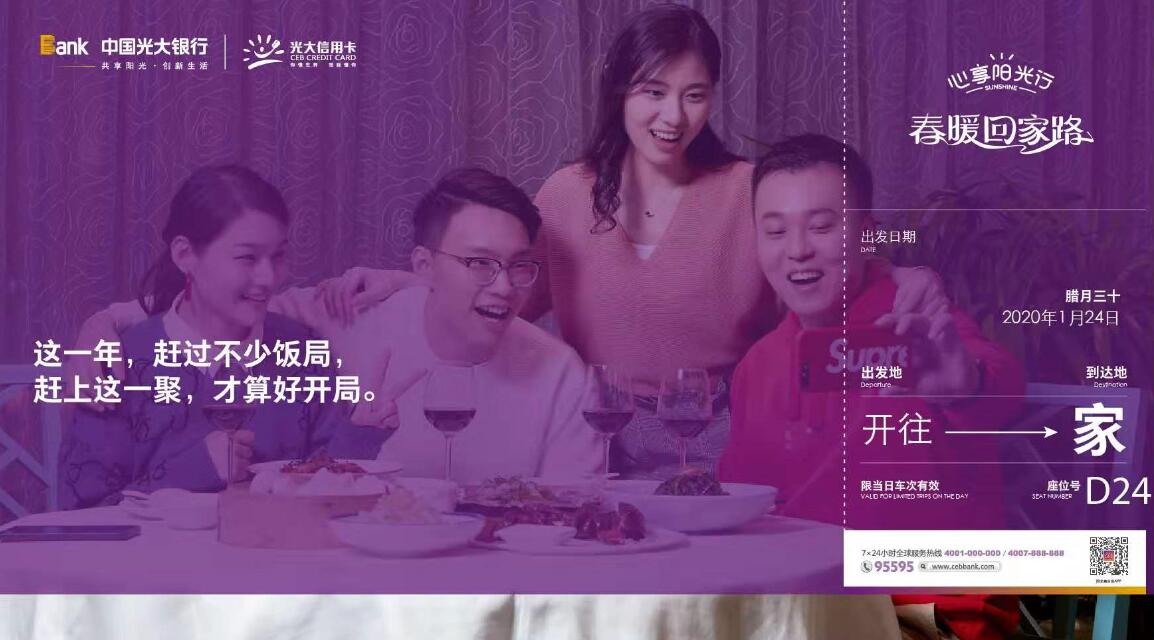 此次“春暖回家路”活動將在全國多地同步開展,圍繞餐飲、出行、娛樂等多種春節(jié)期間關鍵場景,光大信用卡推出十余個優(yōu)惠活動,包括國內機票優(yōu)惠立減、旅游線路優(yōu)惠立減、10元購50元飯票、18元購50元滴滴專車權益包、口碑優(yōu)惠滿減、口碑APP滿額減等?;顒又攸c從“回家路途”延伸到“回到家后”,涵蓋團圓、走親訪友等各類場景,其中針對年夜飯場景特別推出新春主題榜單、藏寶小鎮(zhèn)兌紅包、餐飲主題快閃店三大核心玩法。此外,2020年是全面建成小康社會的決勝之年,“擁軍愛國送溫暖”等公益行動同步開展,讓“關愛”“正能量”成為2020年春節(jié)的關鍵詞。