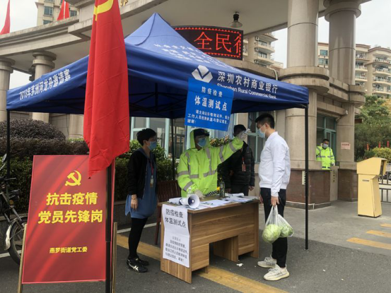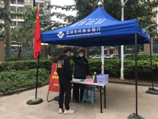 隨著疫情防控形勢的發(fā)展,深圳各街道各社區(qū)都不斷加強疫情防控,在道路口、社區(qū)出入口、樓棟出入口對進出車輛和人員進行篩查。在燕羅街道、松崗街道轄內的道路卡口、社區(qū)門口、街道養(yǎng)老院、工廠等防疫檢查站點,記者看到很多印有深圳農商行名稱的藍色帳篷。一頂頂帳篷就像一把把‘保護傘’,為防控工作人員提供了遮風擋雨的場所,也守護著轄區(qū)居民的健康。
