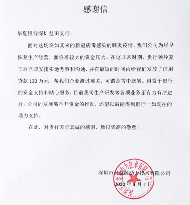 抗疫企業(yè)為華夏銀行深圳益田支行發(fā)來感謝信