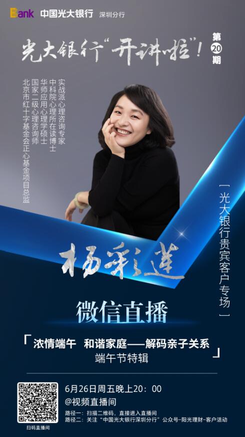 見(jiàn)圳客戶(hù)端·深圳新聞網(wǎng)2020年6月24日訊 端午節(jié)臨近,光大銀行深圳分行將攜手深圳熱線(xiàn)于6月26日,在線(xiàn)開(kāi)展第二十期《光大銀行"開(kāi)講啦“!》公益課堂。