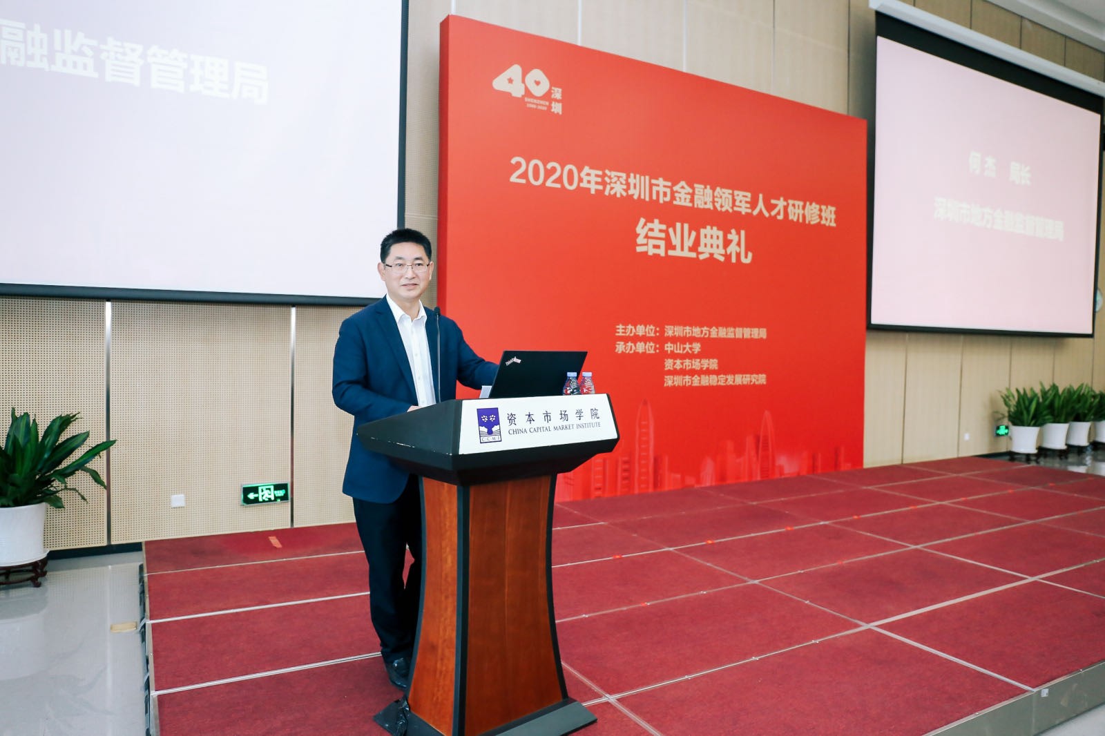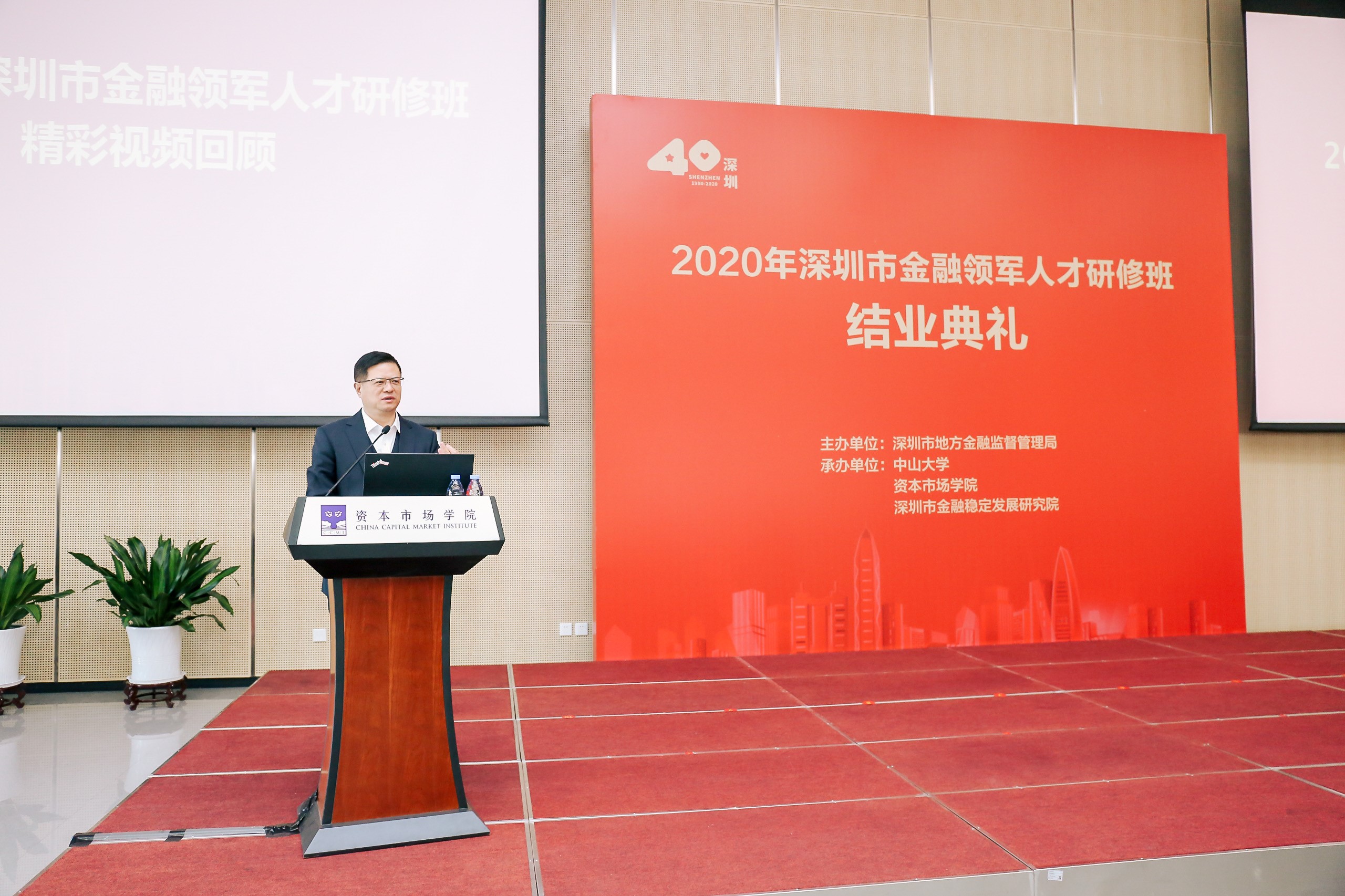 1月30日上午,2020年深圳金融領(lǐng)軍人才研修班結(jié)業(yè)典禮在資本市場學(xué)院隆重舉辦。本期研修班由深圳市地方金融監(jiān)督管理局主辦,中山大學(xué)、資本市場學(xué)院、深圳市金融穩(wěn)定發(fā)展研究院共同承辦。市地方金融監(jiān)管局黨組書記劉平生主持結(jié)業(yè)典禮并致辭,局長何杰作總結(jié)講話。資本市場學(xué)院副理事長、深圳市原副市長唐杰教授,資本市場學(xué)院黨委書記陳自強、院長金立揚、副院長張韶輝,深圳銀保監(jiān)局副局長陳飛鴻、深圳證券交易所紀委書記邢力紅,市地方金融監(jiān)督管理局副巡視員林居正,中山大學(xué)嶺南學(xué)院院長陸軍教授,以及市委組織部、人民銀行深圳市中心支行、深圳證監(jiān)局有關(guān)領(lǐng)導(dǎo)應(yīng)邀出席,本期研修班近110名學(xué)員參加活動。