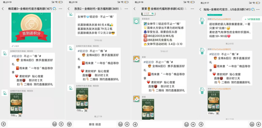 為了提升活動(dòng)效果以及節(jié)日噱頭,招行深圳分行積極向商戶爭(zhēng)取了全棉時(shí)代的直播禮品,直播當(dāng)天全棉時(shí)代為招行用戶提供價(jià)值50萬(wàn)的禮品,同時(shí)在宣傳端,為了打造活動(dòng)熱點(diǎn),全棉時(shí)代在超過(guò)500個(gè)社群內(nèi)進(jìn)行活動(dòng)推送,招行端也積極爭(zhēng)取總行資源,在App、微信視頻號(hào)及朋友圈進(jìn)行宣傳。
