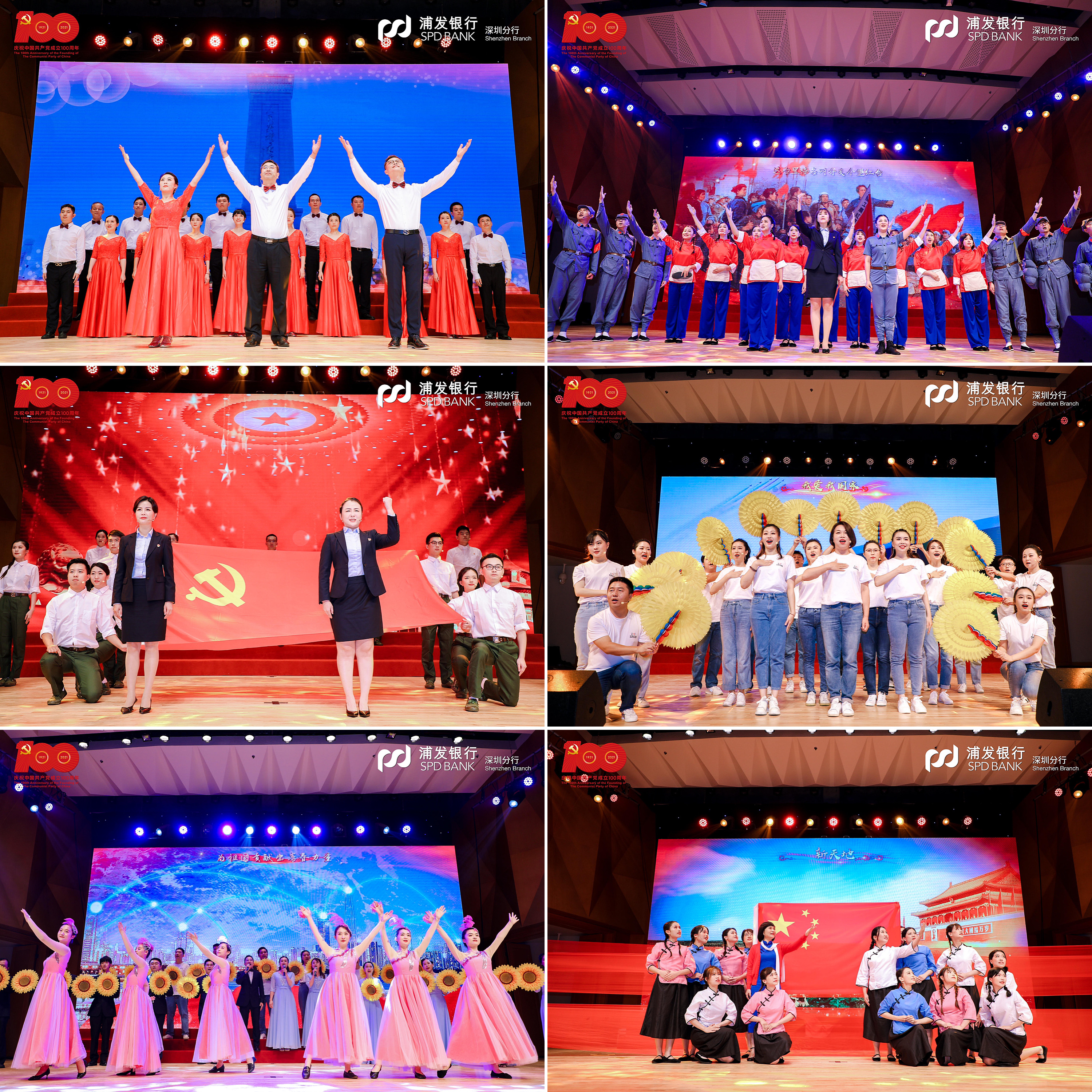 在黨支部風(fēng)采展示環(huán)節(jié),該行基層黨支部精心編排12首紅色經(jīng)典,通過4個(gè)篇章再現(xiàn)百年波瀾壯闊的偉大歷程。第一篇章“開天辟地”演繹了中國(guó)共產(chǎn)黨在新民民主義革命時(shí)期完成救國(guó)大業(yè)的輝煌歷程,《保衛(wèi)黃河》吹響了高亢嘹亮的愛國(guó)號(hào)角,《十送紅軍》深情演繹血濃于水軍民情,《繡紅旗》一腔熱血帶著大家重回歌樂山。第二篇章“改天換地”回顧了中國(guó)共產(chǎn)黨在社會(huì)主義革命和建設(shè)時(shí)期完成興國(guó)大業(yè)的奮斗史詩,《歌唱祖國(guó)》撥動(dòng)人們最難忘的記憶,《我們走在大路上》展現(xiàn)當(dāng)年敢闖敢拼的奮進(jìn)之姿態(tài),《唱支山歌給黨聽》唱出人民心中永恒的贊歌。第三篇章“翻天覆地”再現(xiàn)了中國(guó)共產(chǎn)黨在改革開放和社會(huì)主義現(xiàn)代化建設(shè)新時(shí)期推進(jìn)富國(guó)大業(yè)的光榮壯舉,《在燦爛陽光下》重現(xiàn)春風(fēng)化雨之后的奮斗時(shí)光,《國(guó)家》打動(dòng)多少人的赤子之心,《我們的生活充滿陽光》訴說了改革開放背后的喜悅。第四篇章“驚天動(dòng)地”展現(xiàn)了中國(guó)共產(chǎn)黨在中國(guó)特色社會(huì)主義新時(shí)代推進(jìn)并將在本世紀(jì)中葉實(shí)現(xiàn)強(qiáng)國(guó)大業(yè)的偉大時(shí)代,一首《天耀中華》是浦發(fā)人最深沉的表達(dá),《燈火里的中國(guó)》讓人漫步燈火漫卷的萬里山河,《再一次出發(fā)》展示浦發(fā)追夢(mèng)者的雄姿英發(fā)。走過“百年風(fēng)雨”,浦發(fā)銀行深圳分行合唱團(tuán)一首《我和我的祖國(guó)》,蓬勃朝氣盡顯拳拳愛國(guó)心、濃濃赤子情。篇章結(jié)束,大家全體起立,高聲合唱《沒有共產(chǎn)黨就沒有新中國(guó)》,以最真摯最熱烈的歌聲獻(xiàn)禮建黨百年。