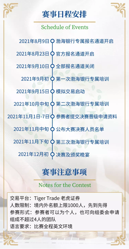 活動(dòng)冠名方——渤海銀行希冀以本賽事的舉辦為契機(jī),通過緊張激勵(lì)而又活潑有趣的模擬投資組合競(jìng)賽形式、寓教于樂,樹立并培養(yǎng)青年一代對(duì)于財(cái)富增長(zhǎng)與傳承的正確理念,引導(dǎo)年輕人理解并實(shí)踐綠色投資,促進(jìn)青年一代“財(cái)商”理念與能力的全面提升。