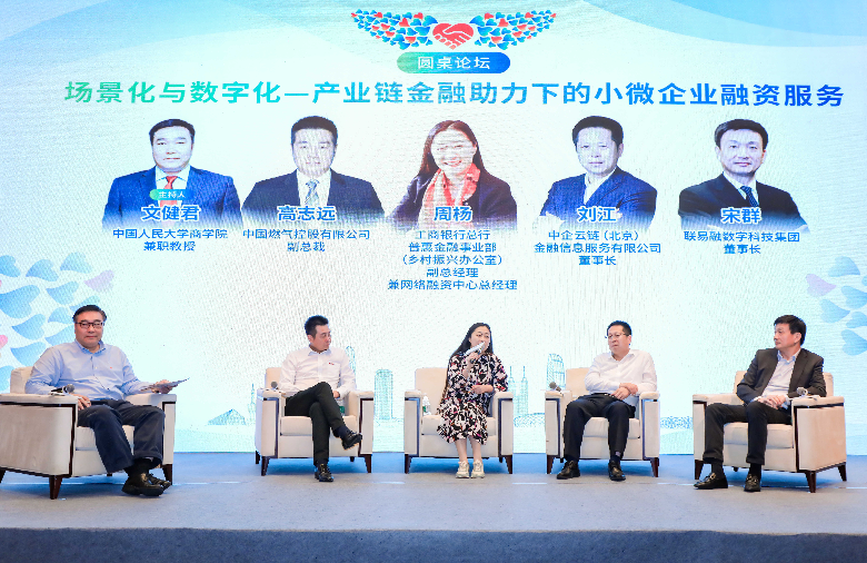 在論壇對話環(huán)節(jié),工行總行普惠金融事業(yè)部副總經(jīng)理兼網(wǎng)絡融資中心總經(jīng)理周楊、核心企業(yè)代表中國燃氣控股有限公司副總裁高志遠、供應鏈服務機構(gòu)代表中企云鏈(北京)金融信息服務有限公司董事長劉江和聯(lián)易融數(shù)字科技集團董事長宋群共同探討了如何以融合和創(chuàng)新方式,通過產(chǎn)業(yè)鏈金融助力小微企業(yè)融資服務,互相交換在產(chǎn)業(yè)鏈金融發(fā)展方面的經(jīng)驗和智慧。