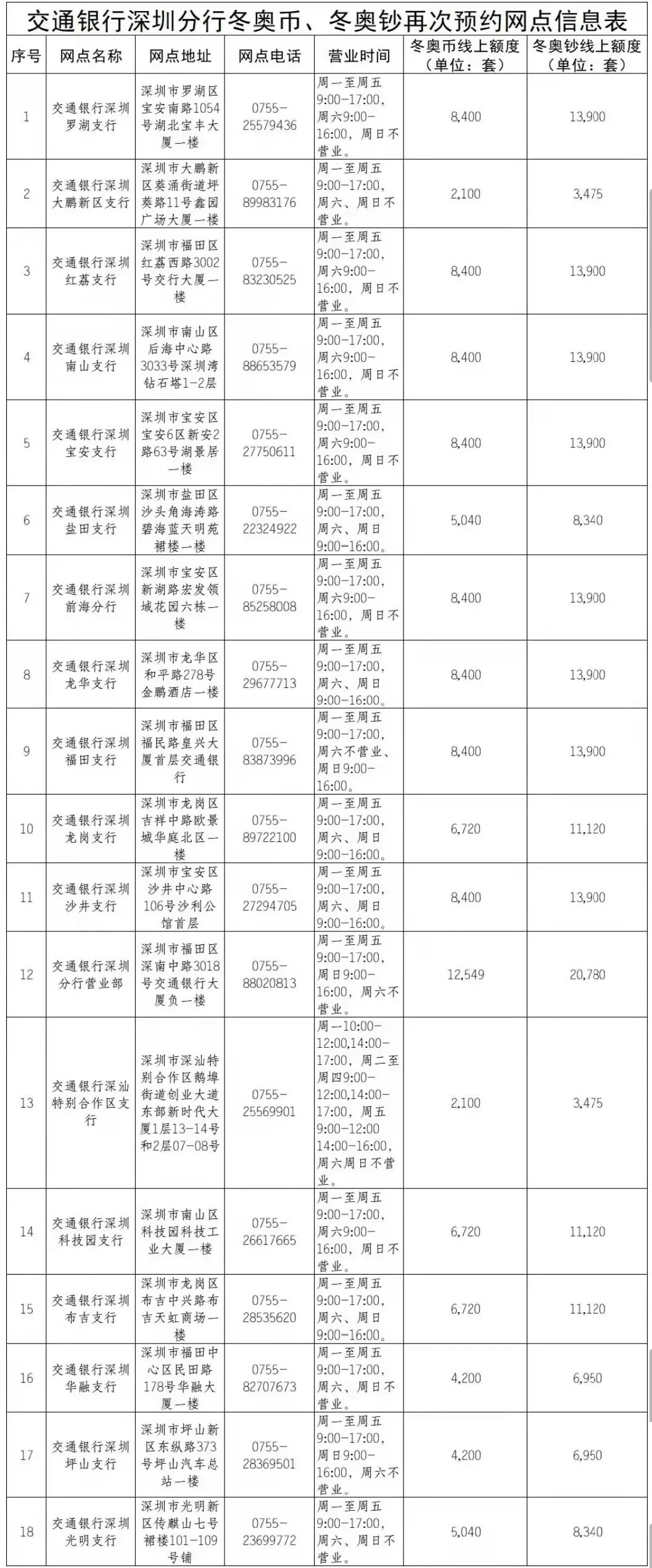 此次預約全部通過深圳交通線上渠道辦理,預約期內先到先得,約滿為止。冬奧幣、冬奧鈔每人預約限額分別為20套。具體預約兌換網點及線上額度信息請查看附件。