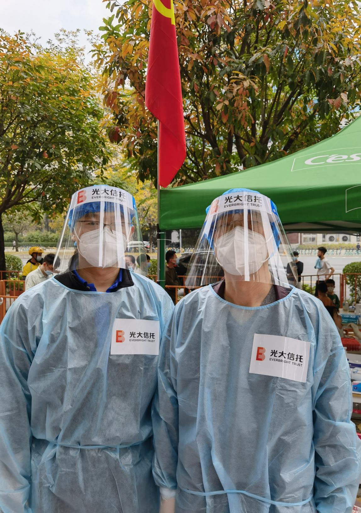 光大信托深圳區(qū)域黨支部在接到協(xié)同抗疫通知后,第一時(shí)間組織黨員和員工積極報(bào)名參與志愿服務(wù)。3月5日,恰逢毛澤東主席“向雷鋒同志學(xué)習(xí)”題詞的紀(jì)念日,光大信托公司風(fēng)險(xiǎn)總監(jiān)姚恒民同志以年近6旬的高齡,率先垂范的沖在一線,帶領(lǐng)深圳區(qū)域黨員同志們,投入福田區(qū)蓮花街道獅嶺社區(qū)的核酸檢測(cè)志愿服務(wù)工作,用實(shí)際行動(dòng)和赤誠(chéng)情懷書(shū)寫(xiě)共產(chǎn)黨員的責(zé)任和擔(dān)當(dāng)。當(dāng)天天氣炎熱,太陽(yáng)暴曬下穿著防護(hù)服兩個(gè)小時(shí)工作下來(lái),全身已完全濕透,但他們以飽滿的激情、負(fù)責(zé)任的態(tài)度詮釋了一個(gè)共產(chǎn)黨員在黨旗下宣誓的誓言。光大信托的一位黨員同志說(shuō):“疫情就是命令,防控就是責(zé)任,崗位就是戰(zhàn)場(chǎng),每個(gè)服務(wù)點(diǎn)的黨旗就是一種信仰,每個(gè)黨員就是一面旗幟,每個(gè)黨支部就是一個(gè)堡壘,哪里有需要,哪里就有光大人的身影?!?/p>