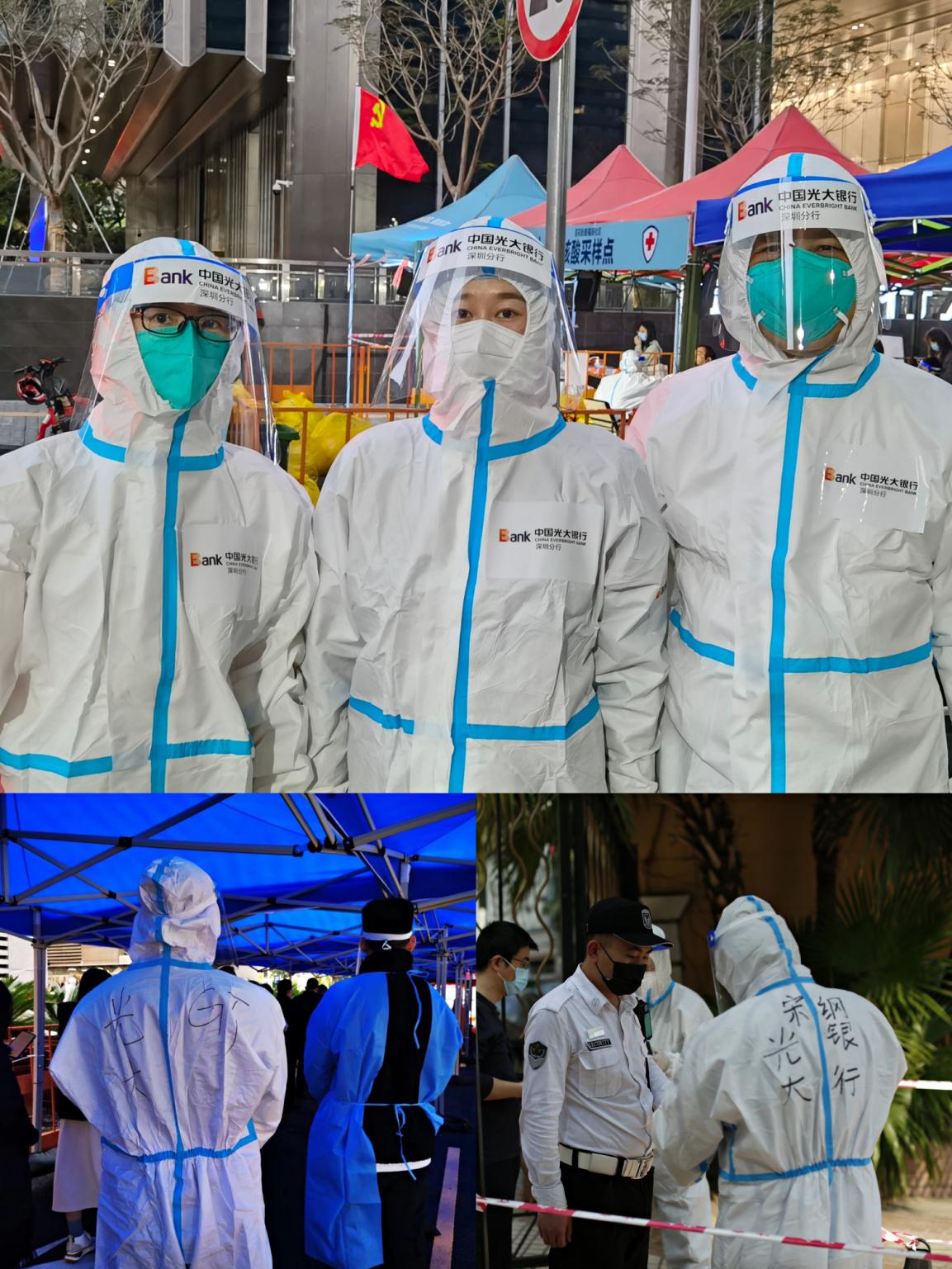 在疫情防控的關(guān)鍵時(shí)期,深圳分行黨委堅(jiān)決貫徹落實(shí)當(dāng)?shù)卣姆揽匾螅中悬h委書(shū)記、行長(zhǎng)韓學(xué)智同志緊急召開(kāi)黨委會(huì)議,啟動(dòng)應(yīng)急預(yù)案,積極部署并投入疫情防控工作,確保日常營(yíng)運(yùn)和客戶服務(wù)等工作有序運(yùn)轉(zhuǎn)。在深圳福田區(qū)金融工作局的組織與號(hào)召下,分行黨委要求全體黨員干部發(fā)揮先鋒模范作用,主動(dòng)為社區(qū)疫情防控工作提供志愿服務(wù)。分行黨委委員們率先垂范,分頭帶領(lǐng)黨員干部奔赴社區(qū)慰問(wèn)抗戰(zhàn)一線工作人員,并犧牲周末休息時(shí)間深入社區(qū)核酸采樣點(diǎn),脫下西裝變身“大白”。深圳分行各黨支部和團(tuán)支部先后組織開(kāi)展各類志愿服務(wù)累計(jì)時(shí)長(zhǎng)超過(guò)100小時(shí),活躍在防疫抗疫一線的同志們?cè)谌ΡU蠌V大群眾金融服務(wù)需求的同時(shí),和醫(yī)護(hù)工作者一同守護(hù)著千家萬(wàn)戶。作為集團(tuán)駐深企業(yè)協(xié)同工作的牽頭單位,分行牽頭組建駐深企業(yè)志愿者先鋒隊(duì),緊急投身福田區(qū)抗擊疫情的各個(gè)戰(zhàn)線和各個(gè)角落,不分晝夜、不論疲倦、以實(shí)際行動(dòng)踐行初心、使命和擔(dān)當(dāng),弘揚(yáng)新時(shí)代共產(chǎn)黨人的奉獻(xiàn)精神?!叭绻皇怯H身體驗(yàn)志愿者服務(wù)工作,永遠(yuǎn)不知道抗疫人員的工作是如此辛苦!有多少人在負(fù)重前行才確保了深圳市民有序和安寧的生活。此刻很想擁抱可親可敬的你們,防護(hù)服雖然阻擋了我們的擁抱,但無(wú)法阻擋我們一起抗擊疫情的心?!币晃恢驹刚哌@樣記錄到。