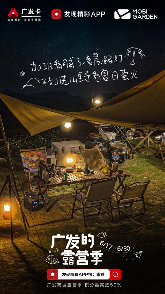 讀特客戶端?深圳新聞網(wǎng)2022年7月6日訊(記者 朱琳)一頂帳篷、一片草地、一桌餐品,呼吸戶外新鮮空氣放松身心……露營逐漸成為年輕人的戶外休閑方式。對此,廣發(fā)信用卡繼推出國內(nèi)首個沉浸式夜宿露營發(fā)布會之后,近日又以露營主題切入新世代年輕人的需求點,布局戶外露營場景,上線為期兩月的“廣發(fā)的露營季”主題活動,在提倡城市生活“慢下來,去感受”理念的同時,也釋放了一大波戶外露營標(biāo)配商品的折扣福利干貨。