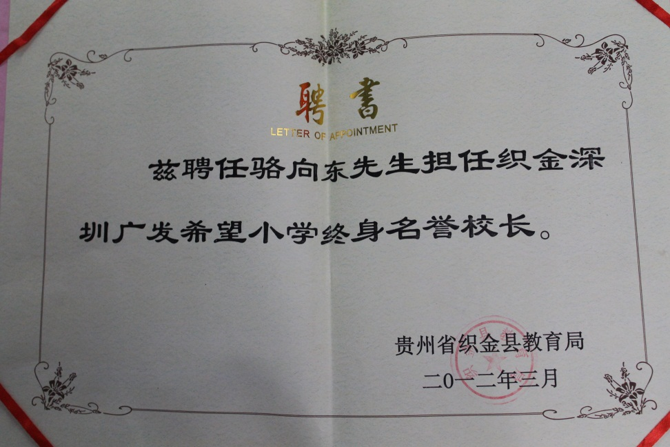 2013年,在駱向東的退休儀式上,織金縣教育局將一張希望小學(xué)終身名譽(yù)校長(zhǎng)的聘書,鄭重交到了他的手上。“我很榮幸能代表廣發(fā)銀行深圳分行黨委去推動(dòng)這件事,但公益事業(yè)任重道遠(yuǎn),我相信愛心基因會(huì)在廣發(fā)一直傳承下去。”事實(shí)也正如駱向東所言,從1998年籌建希望小學(xué)至今,一代代廣發(fā)人身體力行,讓愛心助學(xué)一棒接力一棒。