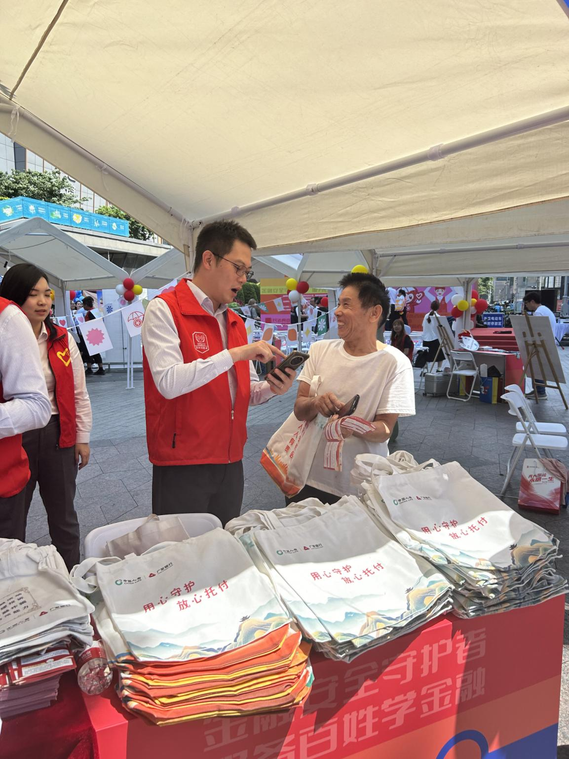 廣發(fā)銀行深圳分行紀委書記杜經濤向現(xiàn)場群眾發(fā)放宣傳購物袋