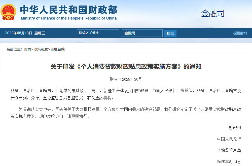 深圳新聞網(wǎng)2025年8月13日訊(記者 湯莎)近日,財(cái)政部、中國人民銀行、金融監(jiān)管總局印發(fā)《個人消費(fèi)貸款財(cái)政貼息政策實(shí)施方案》(以下簡稱方案),中央及省級財(cái)政將對符合條件的個人消費(fèi)貸款實(shí)施貼息。