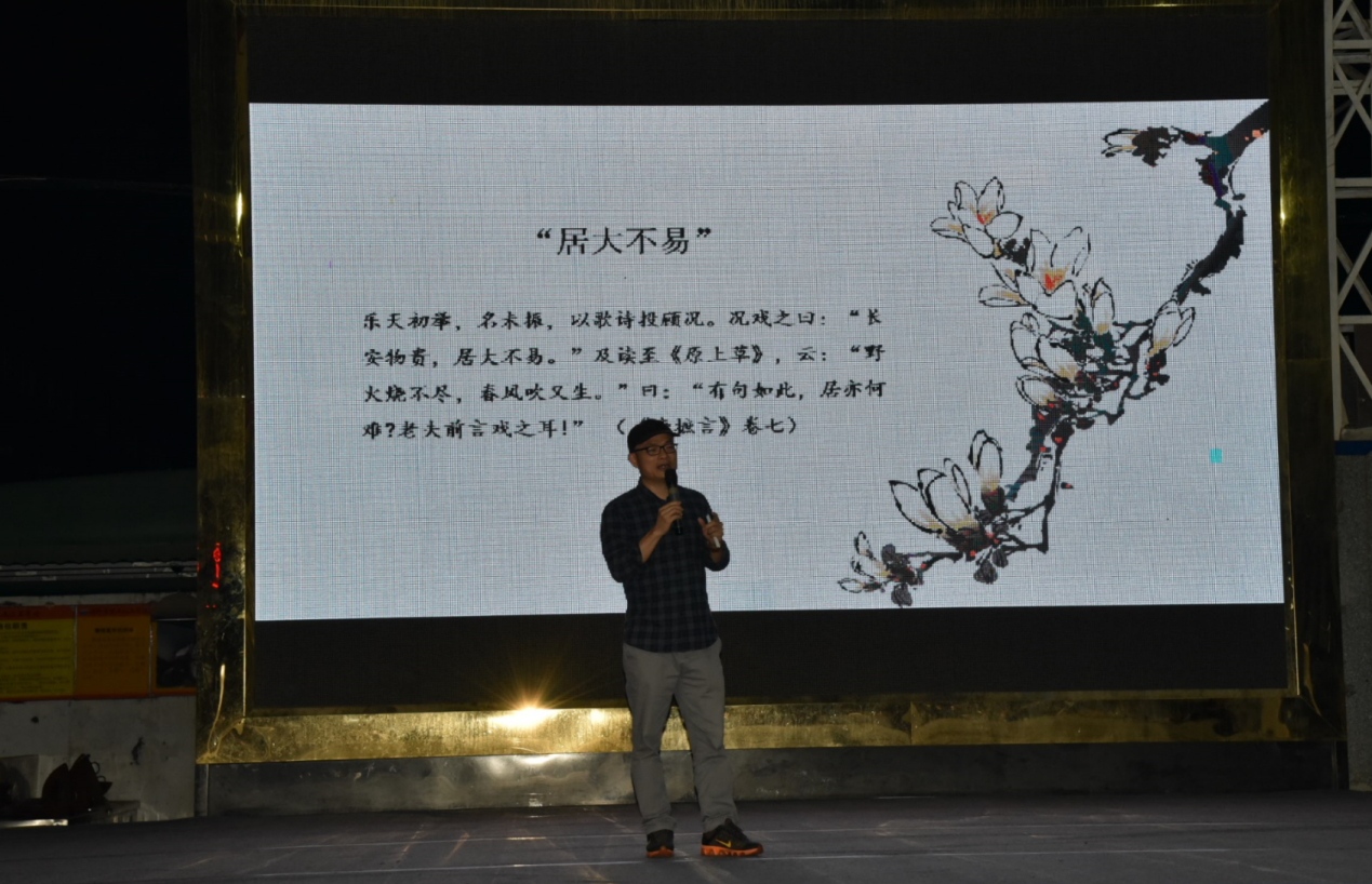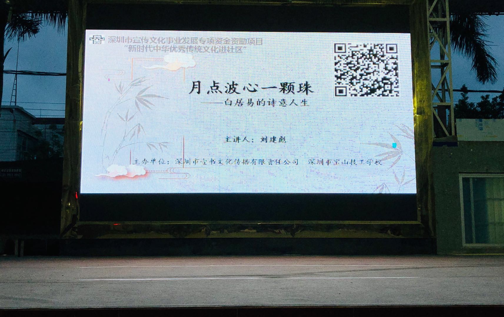 深圳新聞網(wǎng)訊 5月29日晚上,“新時(shí)代中華優(yōu)秀傳統(tǒng)文化進(jìn)社區(qū)”系列活動(dòng)第三場公益文化講座之“月點(diǎn)波心一顆珠——白居易的詩意人生”在深圳市寶山技工學(xué)校寶山大舞臺(tái)拉開帷幕,由愛詩家創(chuàng)始人劉建彪帶領(lǐng)聽眾一同走進(jìn)“詩王”的詩意世界,感悟其至情至性。