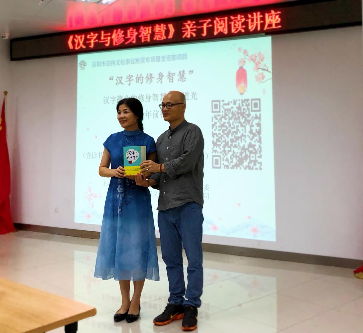 講座在親子之間、講者與聽(tīng)眾之間充滿(mǎn)趣味性的互動(dòng)中接近尾聲,劉建彪先生向龍湖社區(qū)黨群服務(wù)中心圖書(shū)館贈(zèng)送《漢字與修身智慧》書(shū)籍,希望更多的青少年用心感受中華優(yōu)秀傳統(tǒng)文化之美。