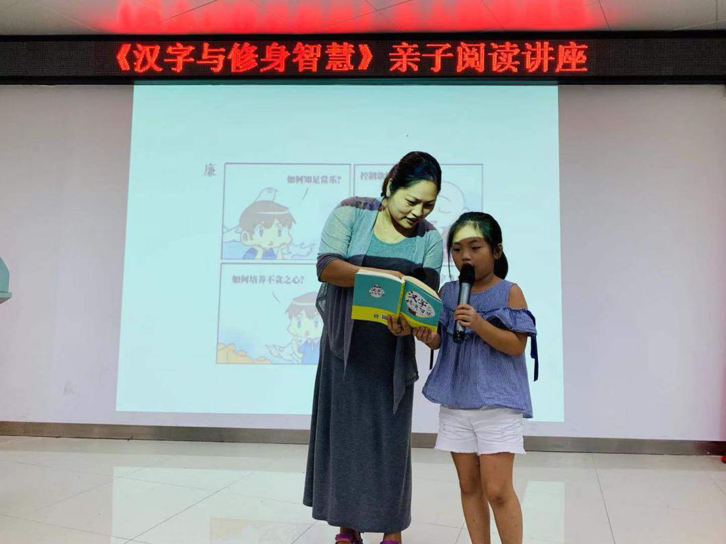 壹讀書(shū)會(huì)創(chuàng)始人、知名閱讀推廣人、《漢字與修身智慧》作者劉建彪先生作為講座的主講人,準(zhǔn)備了“修身三十六字口訣”和漢字的漫畫(huà),以“互動(dòng)為主,講授為輔”的方式,讓現(xiàn)場(chǎng)親子共讀一本書(shū),共同感受漢字的力量。