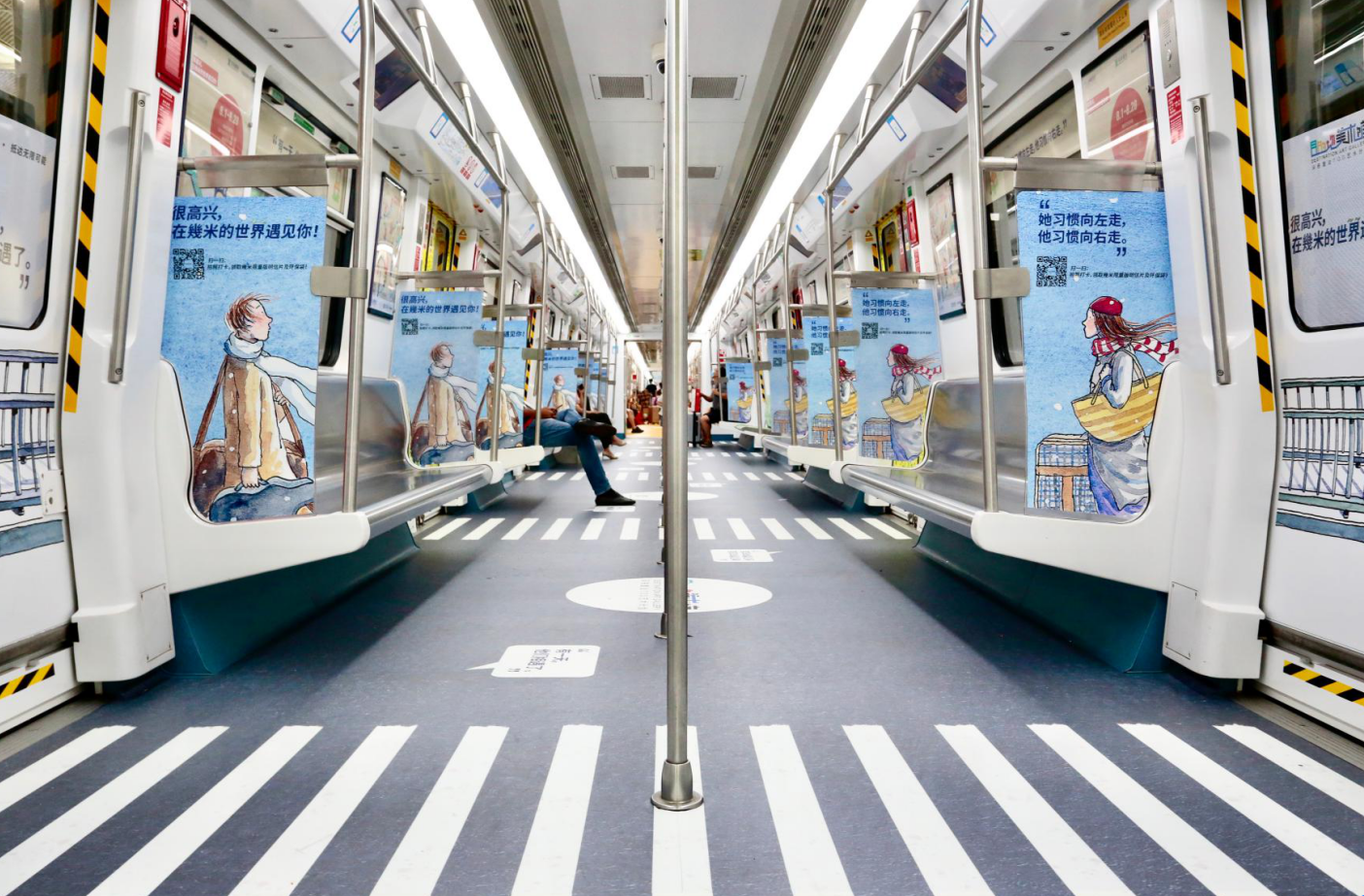 “我信仰藝術(shù),我覺(jué)得它太……太厲害了!”因?yàn)橄M阉囆g(shù)的美好分享給所有人,幾米創(chuàng)作時(shí)總是盡量把自己最在乎的故事和結(jié)構(gòu)變得更簡(jiǎn)單些,打破國(guó)界,讓全世界的讀者和畫(huà)迷都能在他的故事里找到共鳴與寄托。為了更好地傳遞這種藝術(shù)體驗(yàn),本次藝術(shù)計(jì)劃還讓幾米筆下的人物走進(jìn)地鐵車(chē)廂和站廳,等待人們的不期而遇。觀眾在列車(chē)或站點(diǎn)打卡拍照,參與“在幾米的世界遇見(jiàn)你”征集活動(dòng),就有機(jī)會(huì)獲得“目的地美術(shù)館”限量版幾米明信片和環(huán)保袋。