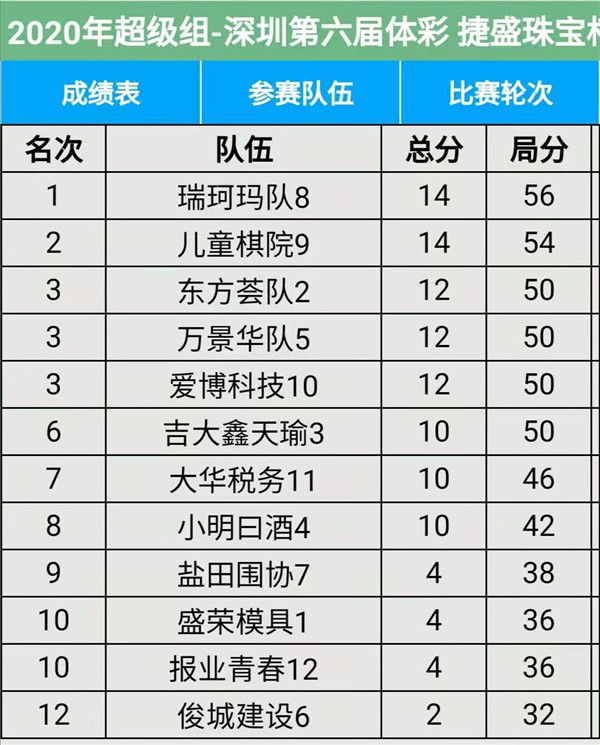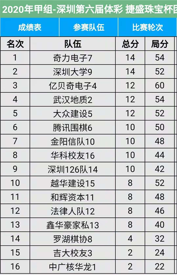 見(jiàn)圳客戶端?深圳新聞網(wǎng)2020年11月15日訊(記者周錦春)第六屆“體彩?捷盛珠寶杯”深圳市圍棋聯(lián)賽繼續(xù)在羅湖區(qū)藝嘉大酒店展開(kāi),今天是第三場(chǎng),有第7輪至第9輪的比賽。目前,超級(jí)組中,瑞珂瑪隊(duì)、兒童棋院隊(duì)在積分榜上排名第一第二,繼續(xù)領(lǐng)先;甲級(jí)組中,奇力電子、深圳大學(xué)在積分榜上排名第一第二。具體賽程結(jié)果請(qǐng)看本文附后表格。