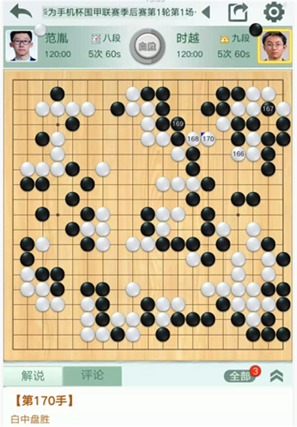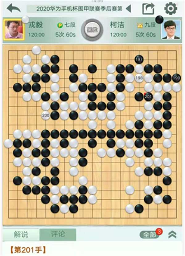 第三臺(tái)慢棋,由深圳隊(duì)的戎毅七段執(zhí)白對(duì)陣民生隊(duì)的柯潔九段。戎毅執(zhí)白對(duì)陣柯潔。開(kāi)局左下變化新穎,白棋略有所得。之后右下角戰(zhàn)斗形成轉(zhuǎn)換,局面依然白好。右邊戰(zhàn)斗中黑棋形狀處理失誤,白棋簡(jiǎn)單整形將是大優(yōu)勢(shì)局面,但是白棋選擇了復(fù)雜的殺黑大龍的變化。最后白棋選擇和黑棋互相分?jǐn)鄬?duì)殺的話,將是白棋正好不行,實(shí)戰(zhàn)不得不放黑棋大龍連回后,白棋敗勢(shì)。最終戎毅執(zhí)白中盤(pán)負(fù)柯潔。