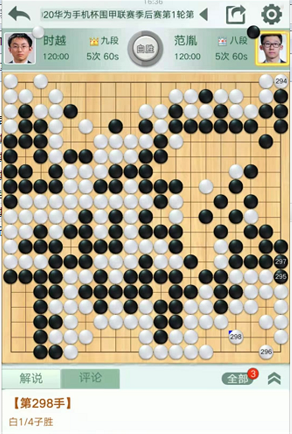慢棋臺第四臺由深圳隊的時越九段執(zhí)白對陣民生隊的范胤八段。中盤右邊白棋進入黑空形成打劫,劫活后局面領先。中央黑棋進攻白棋時候失誤,白棋優(yōu)勢擴大。之后黑棋左邊行棋時候,白棋一直沒有脫先搶占右邊大棋,而是在左邊連續(xù)失誤并且落了后手。被黑走到右邊后黑棋大幅領先。之后右下角形成復雜的打劫,黑棋可以選擇走成三劫循環(huán)和棋后加賽,但是黑棋判斷即便放棄和棋也是局面有利。實戰(zhàn)白棋一直不補搶收官子,最終判斷獲勝時候將三劫循環(huán)變化解消,白棋1/4子獲勝。時越1/4子勝范胤。