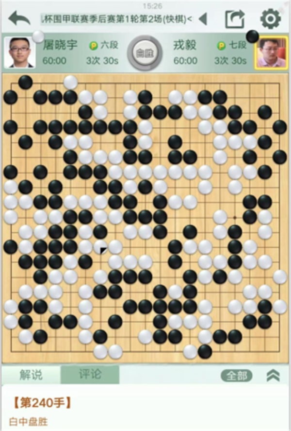 快棋臺由深圳隊戎毅七段執(zhí)黑對陣民生隊的屠曉宇六段。開局黑右上失誤失被白棋先手封住頭,虧損。中盤左邊作戰(zhàn)時候也應該中央出頭,實戰(zhàn)貪吃左邊白棋,被白棋外側滾打包收后劣勢擴大。之后黑棋左下隱患沒有及時自補,被白棋將左下角吃掉,局面已經(jīng)難以挽回。戎毅中盤負屠曉宇。