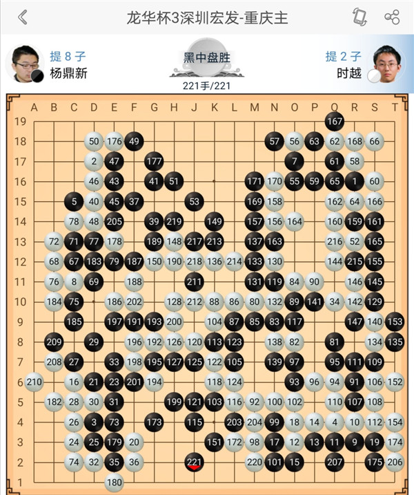 一臺(tái)戎毅執(zhí)黑對(duì)陣?yán)钴幒?,右上?zhàn)斗后黑棋稍有優(yōu)勢(shì),之后黑棋沖擊中央白棋過(guò)分,應(yīng)該慢慢收官,白棋正確應(yīng)對(duì),戰(zhàn)斗中便宜后獲得勝利。二臺(tái)主將時(shí)越執(zhí)白對(duì)陣等級(jí)分排名第二的楊鼎新,中盤(pán)黑棋打入右邊后形成亂戰(zhàn),白棋失誤比黑棋更多,戰(zhàn)斗結(jié)束進(jìn)入官子時(shí)黑勝勢(shì)。