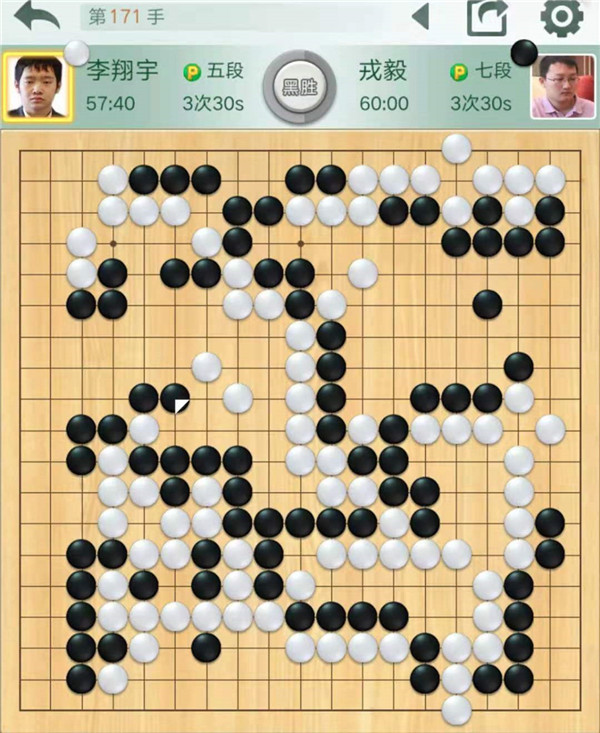 今日比賽中,三臺(tái)快棋戎毅執(zhí)黑對陣小將李翔宇,黑棋下方作戰(zhàn)失利早早進(jìn)入敗勢。后來白棋中央突然將自己大龍走死,黑棋幸運(yùn)獲勝,行棋171手。