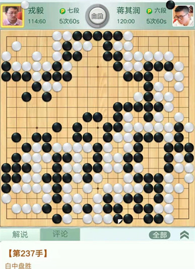戎毅執(zhí)白對(duì)陣蔣其潤(rùn)。開(kāi)局白取地中央黑模樣巨大,白淺消后黑棋攻擊不當(dāng),被白活出兩塊棋后白棋領(lǐng)先。之后黑棋左下棄子圍空又虧損,白棋以較大優(yōu)勢(shì)獲得勝利。