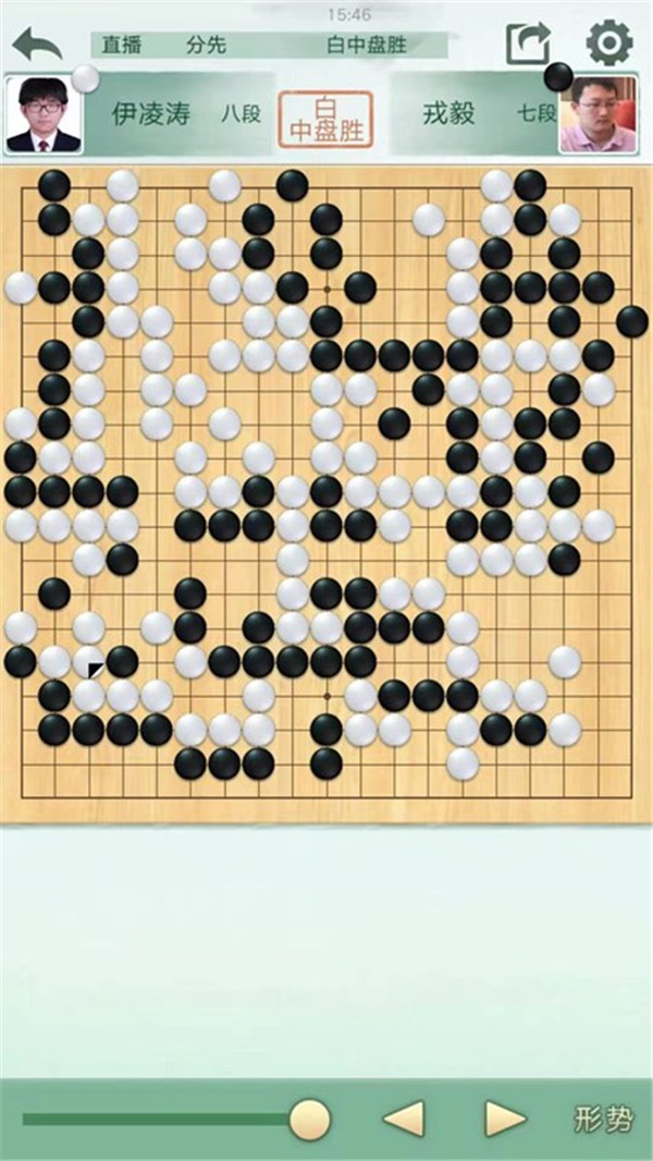 三臺(tái)戎毅執(zhí)黑快棋對陣伊凌濤。開局不久,上方形成復(fù)雜的戰(zhàn)斗,黑棋對殺中次序走錯(cuò),沒有走出黑棋有利的劫爭變化。實(shí)戰(zhàn)的轉(zhuǎn)換得失不成比例,白棋早早勝勢。