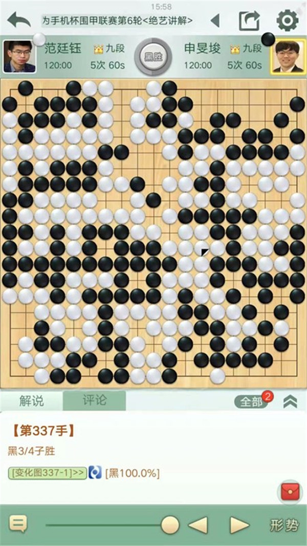 一臺(tái)申旻俊執(zhí)黑對陣世界冠軍范廷鈺。開局下邊白棋攻擊手法不當(dāng),黑處理好后局面領(lǐng)先。中盤黑棋在左邊計(jì)算精準(zhǔn),下出絕妙手段,在白棋空里出棋后優(yōu)勢擴(kuò)大,之后黑棋穩(wěn)扎穩(wěn)打?qū)?yōu)勢保持至終局獲勝。