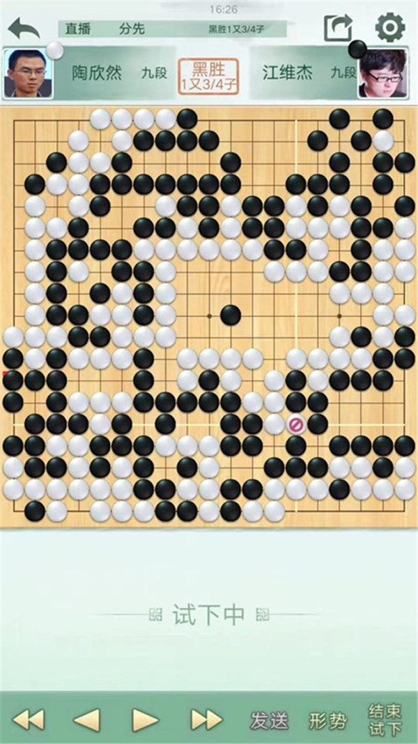 二臺(tái)陶欣然執(zhí)白主將對陣世界冠軍江維杰。開局白有利,左邊白棋進(jìn)攻黑棋時(shí)候手法過于松緩,局面接近。之后白棋中央又出現(xiàn)緩手黑棋領(lǐng)先。之后右上白棋主動(dòng)開劫,但是劫材處理失誤,局面惡化。之后黑棋稍有退讓保持小勝。