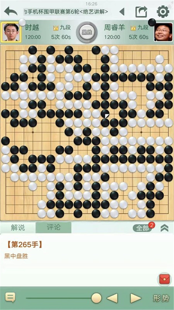 四臺(tái)時(shí)越執(zhí)白對陣世界冠軍周睿羊。中盤白棋侵消黑棋左上大模樣,黑棋付出很大代價(jià)強(qiáng)殺形成打劫。白棋劫爭中不夠細(xì)膩沒有擴(kuò)大戰(zhàn)果而是聯(lián)絡(luò)成活,局面白稍有利。之后白棋左下連續(xù)下出緩手后局面接近。右下角黑棋二路夾試白應(yīng)手時(shí)白棋嚴(yán)重失誤,被黑棋奪走角地后局勢逆轉(zhuǎn)。