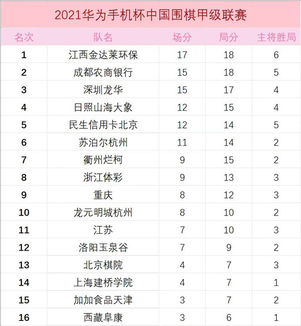 見圳客戶端?深圳新聞網(wǎng)2021年6月7日訊(記者周錦春)華為手機(jī)杯男子圍甲聯(lián)賽在浙江長興重燃戰(zhàn)火, 深圳龍華隊(duì)1:3不敵日照山海大象隊(duì)跌落榜首,排名被江西和成都超越降至第三位。上屆冠軍江西金達(dá)萊環(huán)保隊(duì)本階段首輪繼續(xù)保持勝勢,3比1擊敗北京棋院隊(duì),金身不敗豪取6連勝,并登上積分榜首位。