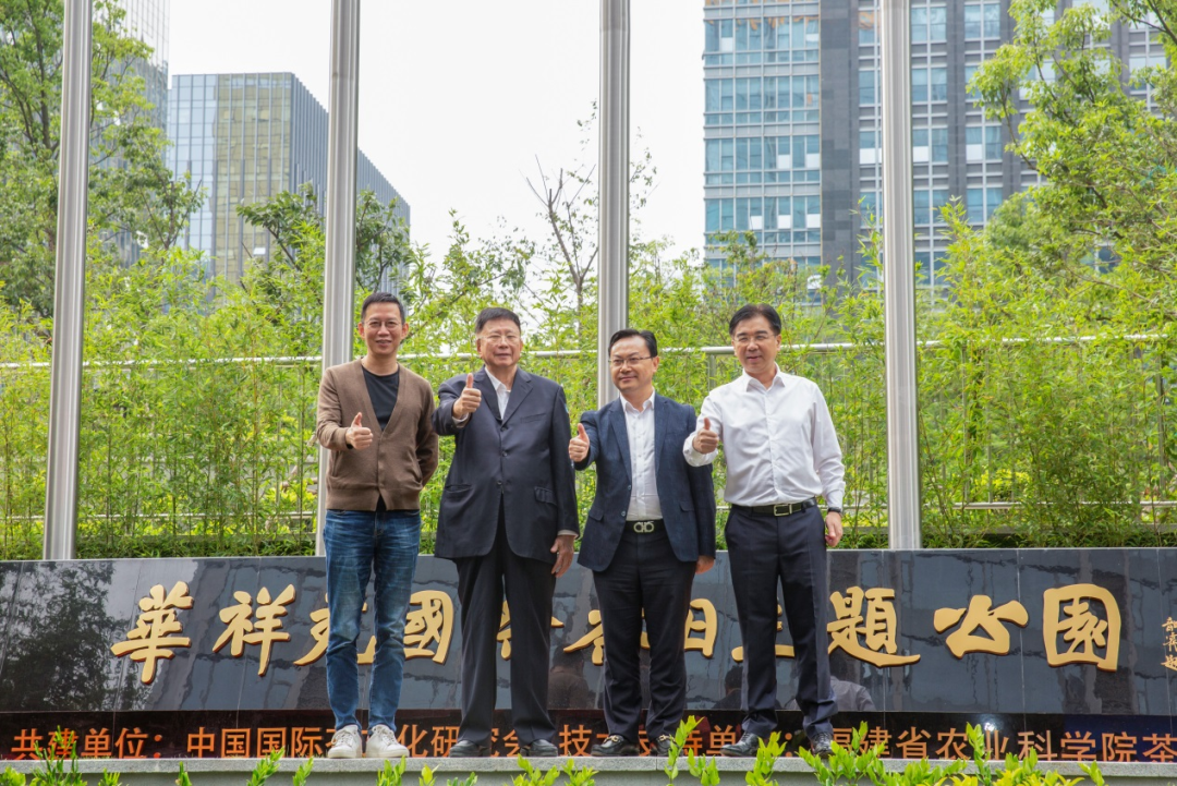 全國(guó)人大常委會(huì)原委員、福建省人大常委會(huì)原副主任、海峽兩岸茶業(yè)交流協(xié)會(huì)高級(jí)顧問(wèn)莊先(左二),中國(guó)工程院院士、湖南農(nóng)業(yè)大學(xué)學(xué)術(shù)委員會(huì)主任劉仲華(右二),著名財(cái)經(jīng)作家、華祥苑國(guó)貨推薦官吳曉波(左一),華祥苑茶業(yè)股份有限公司董事長(zhǎng)肖文華(右一)共同為主題公園開園揭幕。為慶賀國(guó)際茶日而建的主題公園——521國(guó)際茶日主題公園,盛大開園!世界茶樹在這里匯聚,華祥苑八大莊園的茶樹于此展現(xiàn),學(xué)習(xí)堂里有對(duì)中國(guó)茶發(fā)展的殷殷囑托。中國(guó)茶文化的世界坐標(biāo),中國(guó)傳統(tǒng)文化的世界表達(dá),再添新章。