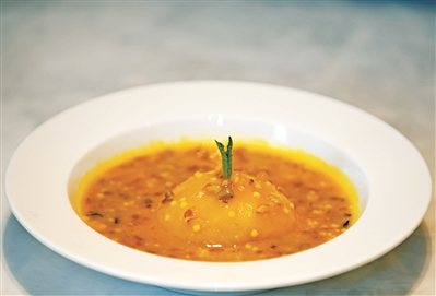 這道菜選擇泰國的西米、江西的紅米、美國的野米、東北的小米和河北的燕麥5種雜糧,預(yù)先浸泡蒸熟備用。半個(gè)蘋果削皮浸泡鹽水后蒸熟備用。將南瓜蒸熟后用破壁機(jī)打成南瓜茸,放入平底鍋,小火加熱,放入五谷雜糧慢慢推至均勻。這道菜神奇的地方,在于如果你喜歡甜,可以放糖作為飯后甜品;如果你喜歡咸味,則可以放鹽,作為代餐主食。調(diào)好味道后,放入蘋果加熱到溫度適合,就可以上碟。