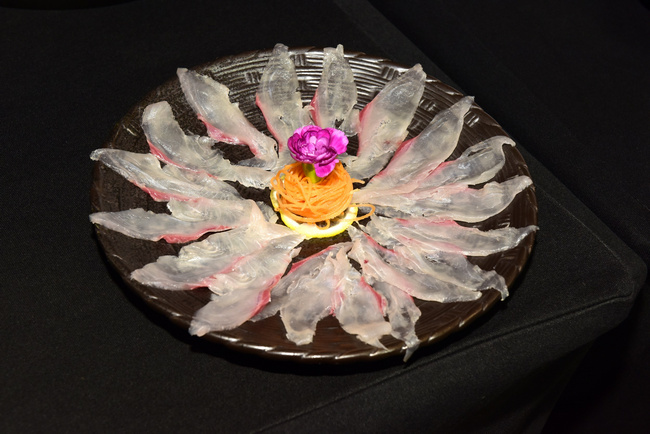 本次品鑒會晚宴以富谷紅鰭東方鲀?yōu)橹黝},共呈現(xiàn)了七道河豚及相關(guān)產(chǎn)品菜品:包括:紅燒河豚、白汁河豚、白溜河豚魚片、紅燒海參靈芝菇、河豚魚皮絲、河豚魚丸湯、河豚魚水餃等,與會嘉賓共同品鑒,對河豚食材鮮美贊不絕口。(常軍平)
