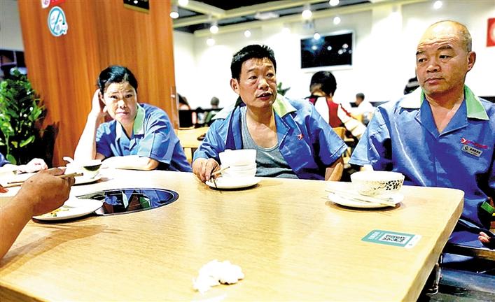 在店里吃飯的人群里,有一張臺全是清一色的藍色工作服,特別顯眼?!拔覀兠刻於紩磉@里吃早餐,差不多有一年時間了,這里的老板太好了,希望他能一直開下去?!边@幾個大叔、大嬸是周邊物業(yè)的清潔工人,他們每天早上5點鐘就上崗工作,忙完就到了6-7點,又餓又累,有一碗熱騰騰的早餐是一件非常幸福的事,而這種開心快樂的事情在這里發(fā)生了。吳姓清潔工說,這里的老板和員工很好,大家來這里吃粥,沒有感到半點不自在,就像在自己家一樣。