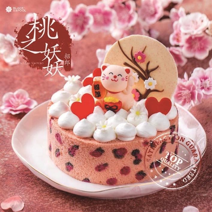 據(jù)黑池產(chǎn)品經(jīng)理介紹,“招郎蛋糕”是黑池最近重磅推出的新產(chǎn)品。蛋糕周圍覆盆子果干點(diǎn)綴而成的粉色豹紋,讓整個(gè)蛋糕充滿了野性魅惑又不失少女甜美。最為吸引眼球的,則是蛋糕表面,被桃花簇?fù)碇囊恢弧罢欣蛇鳌薄_@只軟萌可愛的“招郎喵”,象征著,對(duì)得到這款蛋糕的人,最美好的祝愿,希望他們能夠遇到最好的愛情,找到心目中的那個(gè)他。
