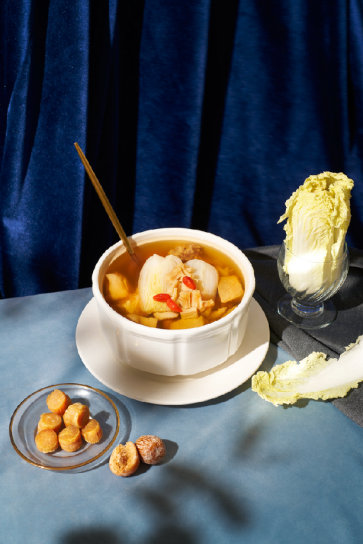 瑤柱菜膽燉土豬展湯,80頭干瑤柱經(jīng)過(guò)發(fā)泡,和優(yōu)選食材的土豬肉,娃娃菜一塊入燙盅燉6小時(shí)。水甘味甜,有滋補(bǔ)清潤(rùn)作用。