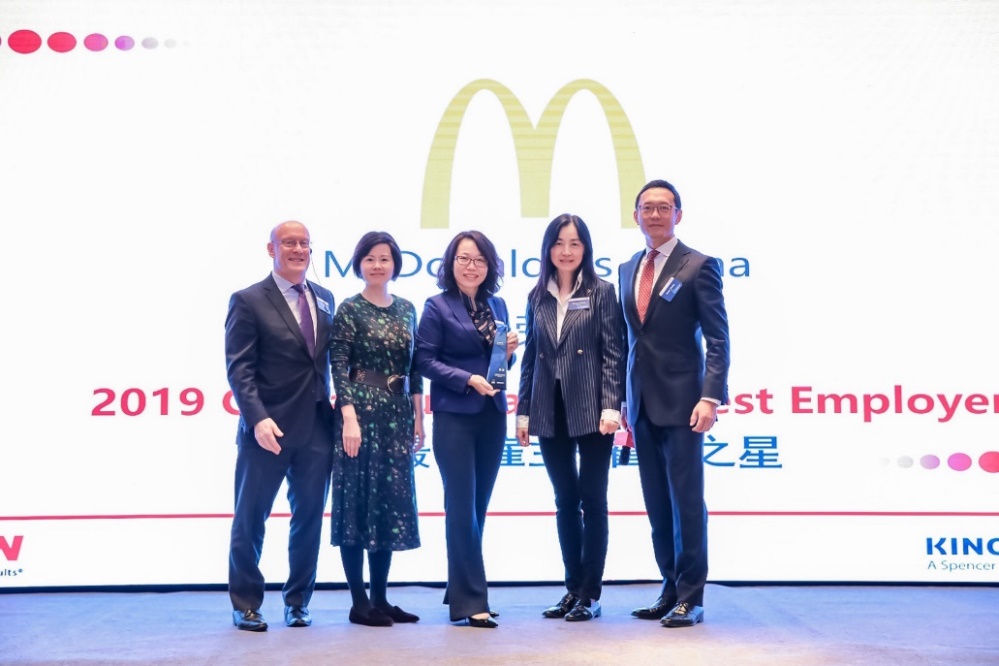 麥當(dāng)勞中國(guó)首席人員官王艷偉(中 )代表公司接受2019“怡安中國(guó)最佳雇主”稱號(hào)